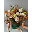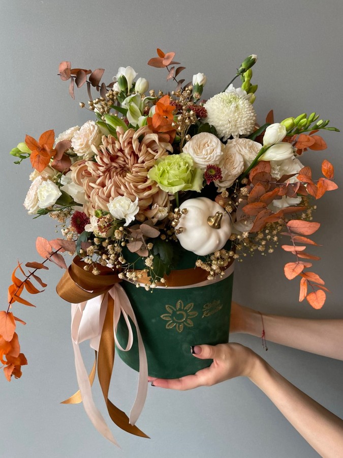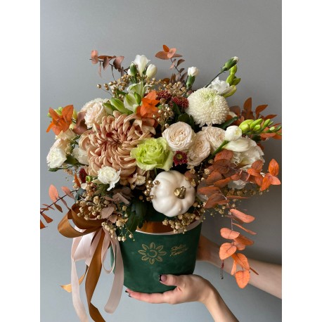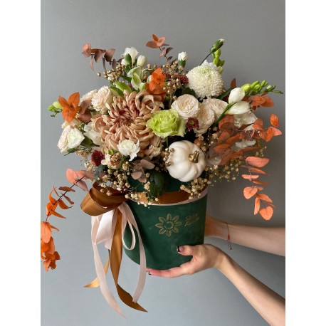 „Jesienny Box” to elegancka kompozycja zamknięta w zielonym, welurowym pudełku – idealna dla miłośników ciepłych barw i sezonowych akcentów. Kremowe róże, karmelowe chryzantemy, drobne eustomy i klasyczne złocienie łączą się tu z jesiennymi liśćmi, złoconymi dodatkami oraz uroczą mini dynią, która nadaje całości wyjątkowego, sezonowego charakteru.