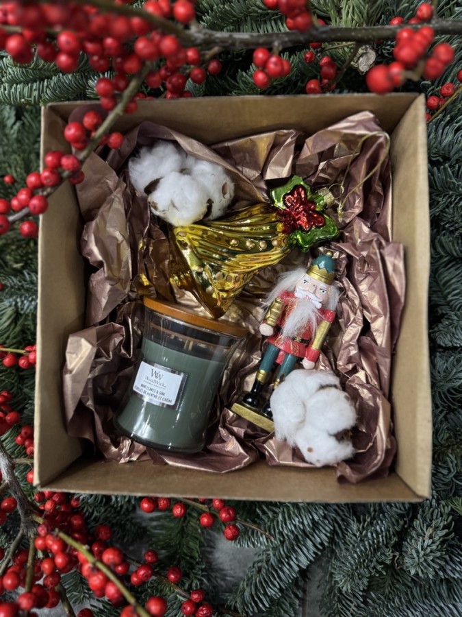 Ciepły, naturalny box prezentowy inspirowany zimowym lasem i tradycyjnymi świętami. Połączenie zieleni, złota i czerwieni wprowadza spokojny, domowy klimat – idealny na grudniowe wieczory przy choince.