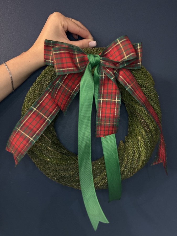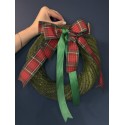 Wianek utrzymany jest w naturalnej zieleni, bez dodatkowych dekoracji, a jego jedyną ozdobą jest efektowna kokarda w kratę w odcieniach czerwieni i zieleni, uzupełniona długimi, eleganckimi wstążkami. Dzięki temu całość prezentuje się lekko, harmonijnie i bardzo estetycznie.