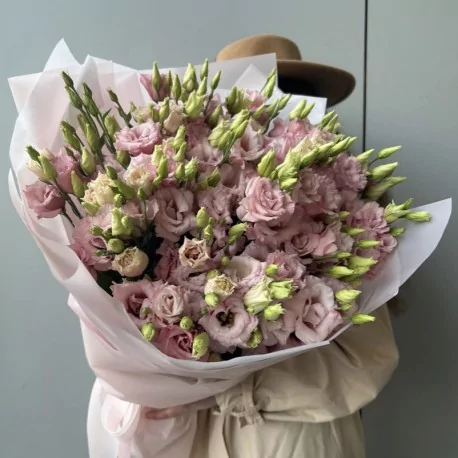 Niezwykle modna kompozycja delikatnych eustom owiniętych w papier i przyozdobiona kokardą.