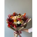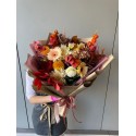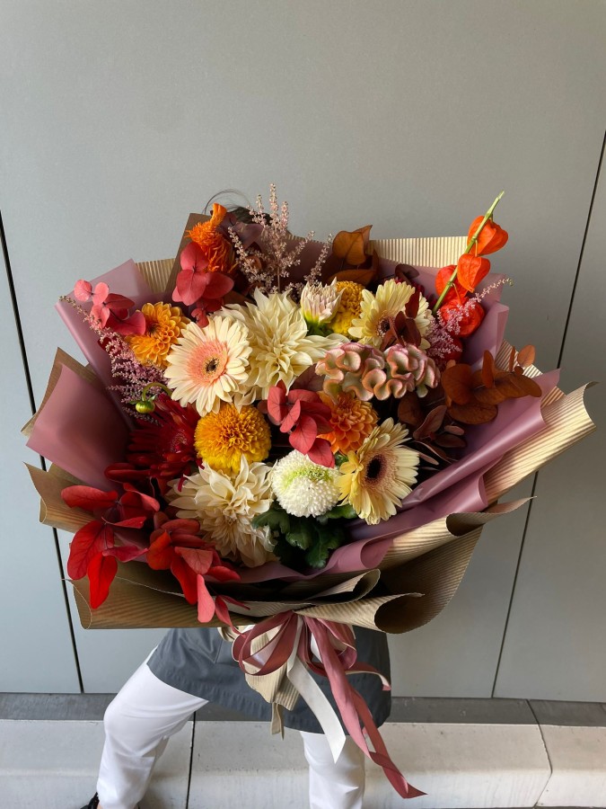 Bukiet „Barwy Jesieni” to wyjątkowa kompozycja inspirowana kolorami złotej polskiej jesieni. Połączenie głębokich czerwieni, ciepłych pomarańczy, kremów, beżów i bordo tworzy bogaty, przytulny klimat, który rozgrzewa samym spojrzeniem.