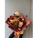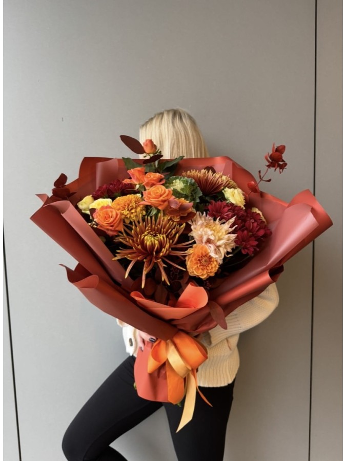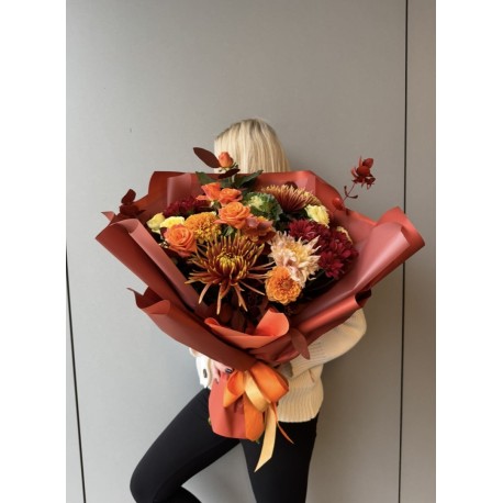 Znalazły się tu m.in. róże, chryzantemy, margaretki, hortensje i jesienne liście, starannie skomponowane i oprawione w intensywnie rdzawy papier z satynową wstążką w ciepłych tonacjach.