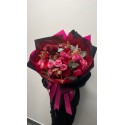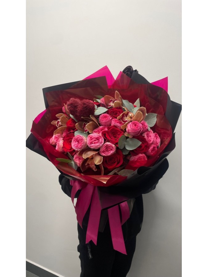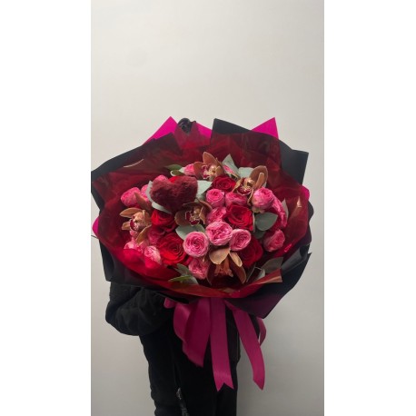 Desire to luksusowy, intensywny bukiet stworzony z myślą o silnych emocjach. Kompozycja łączy klasyczne czerwone róże z różowymi gałązkowymi odmianami, eleganckimi storczykami oraz dekoracyjną zielenią eukaliptusa. Całość uzupełnia subtelny akcent w kształcie serca, podkreślający romantyczny charakter bukietu.