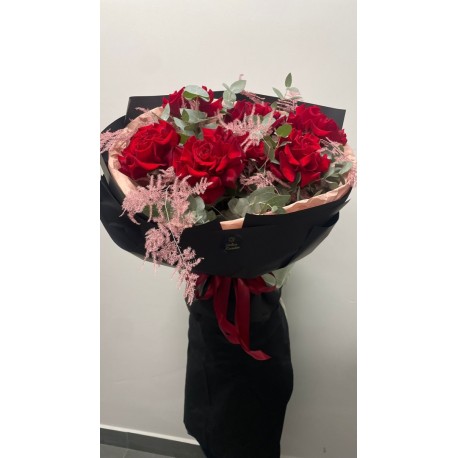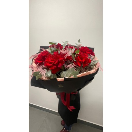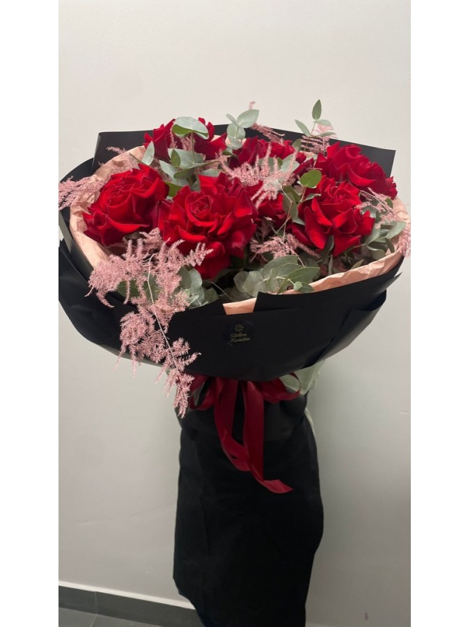 „Velvet Red” to luksusowy bukiet złożony z intensywnie czerwonych róż, które zachwycają aksamitną strukturą płatków i głębokim kolorem. Kompozycję uzupełniają delikatne, pudrowe akcenty oraz świeża zieleń eukaliptusa, tworząc elegancką całość o wyrafinowanym charakterze.