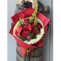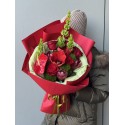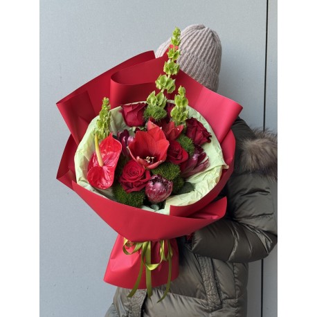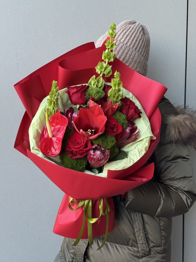Amor to wyrazisty bukiet utrzymany w głębokich odcieniach czerwieni, przełamanych świeżą zielenią. Kompozycja łączy klasyczne róże z efektownymi kwiatami sezonowymi, tworząc elegancką, dynamiczną całość o mocnym charakterze.