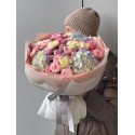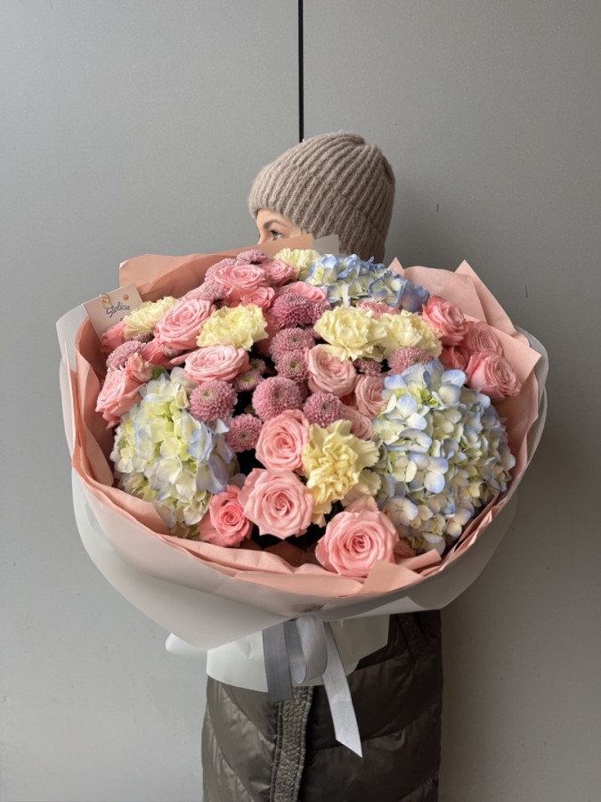 Pudrowe róże w odcieniach brzoskwini i różu przeplatają się z kremowymi goździkami oraz efektownymi hortensjami w pastelowym błękicie. Całość tworzy harmonijną, świeżą kompozycję pełną lekkości i elegancji. Delikatne, jasne pakowanie podkreśla jej subtelny i nowoczesny styl.