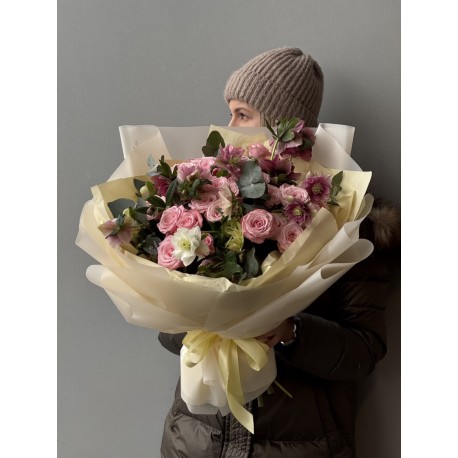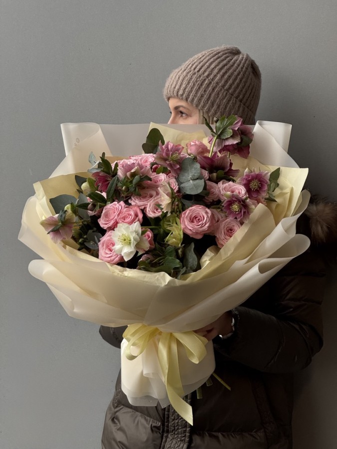 Subtelne róże gałązkowe zostały połączone z efektownymi ciemiernikami oraz świeżą zielenią eukaliptusa, tworząc harmonijną, stylową całość. Jasne, kremowo-żółte pakowanie dodaje bukietowi lekkości i podkreśla jego wyjątkowy, dopracowany charakter.